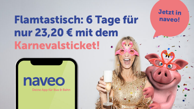Das digitale Karnevals-Ticket macht es möglich: Für 23,20 Euro ist man ganze sechs Tage lang von Fettdonnerstag, 12. Februar und Veilchendienstag, 17. Februar, im gesamten AVV-Netz mobil. Das Ticket gibt es jetzt ausschließlich als Handy-Ticket in der naveo-App. Es ist gültig für eine Person und beliebig viele Fahrten im genannten Zeitraum. Kinder bis einschließlich 5 Jahren fahren gratis mit. Für die Jecken, die allein oder in der Gruppe an nur einem Tag unterwegs sind, lohnen sich die 24-Stunden-Tickets des AVV, die in der naveo-App, beim Fahrpersonal, an Automaten, sowie in Vorverkaufsstellen erhältlich sind.