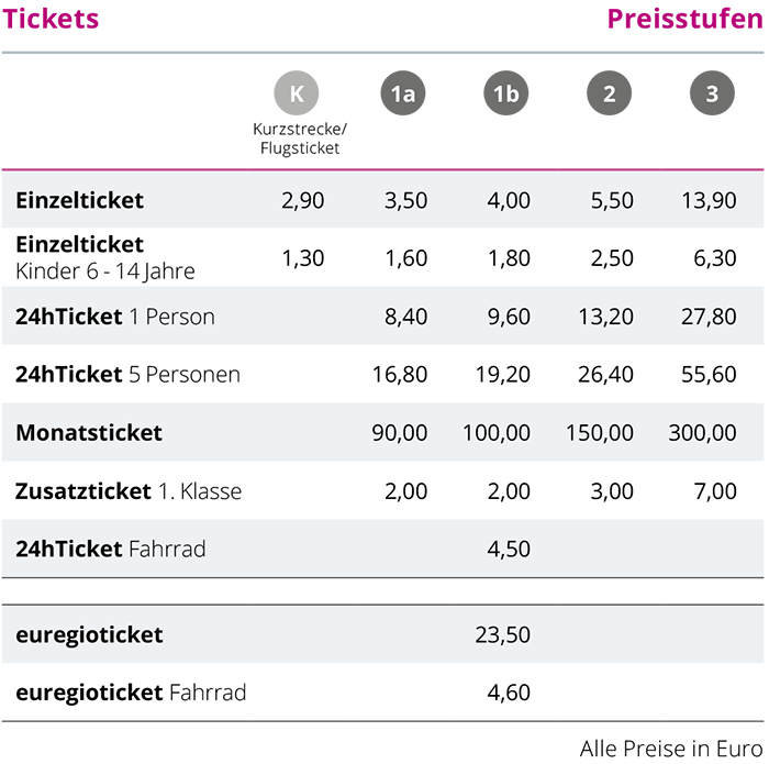 - Preisstufe 1b (Aachen, Bonn, Köln): 2,00 Euro